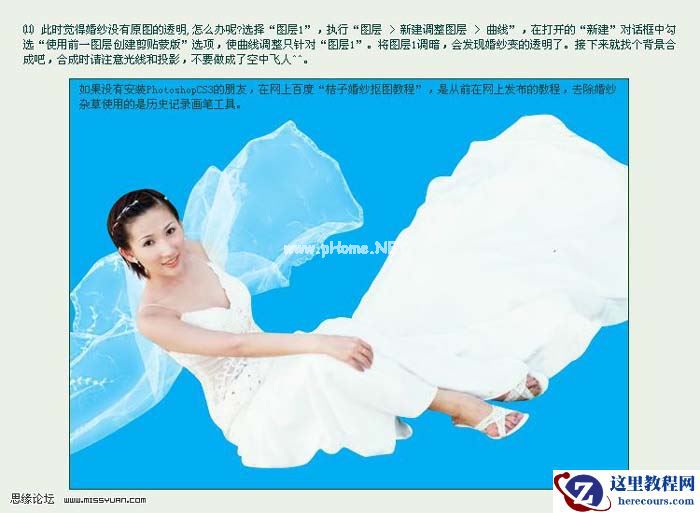 11、此时觉得婚纱没有原图的透明,怎么办呢?选择“图层1”,执行图层-新建调整图层-曲线,在打开的“新建”对话框中勾选“使用前一图层创建剪贴蒙版”选项,使曲线调整只针对“图层1”,将图层1调暗,会发现婚纱变的透明了,接下来就找个背景合成吧,合成时请注意光线的投影,不在做成辽空中飞人。