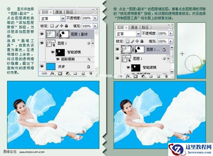 9、显示并选择“图层1副本”点击图层调板底部的“添加图层蒙版”按钮,为该层添加图层蒙版,选择“画笔工具”,前景色设置为黑色,在透明婚纱上涂抹,将该层的透明婚纱隐藏,露出下面制作的透明婚纱的效果。