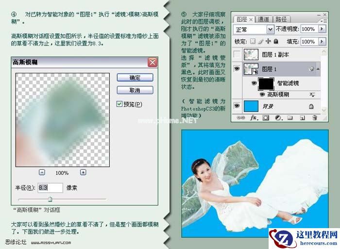 4、对己转为智能对象的“图层1”执行滤镜-模糊-高斯模糊,高斯模糊对话框设置如图所示,半径的设置标准为婚纱上面的草看不清为止,这里我们设置为8.3像素。