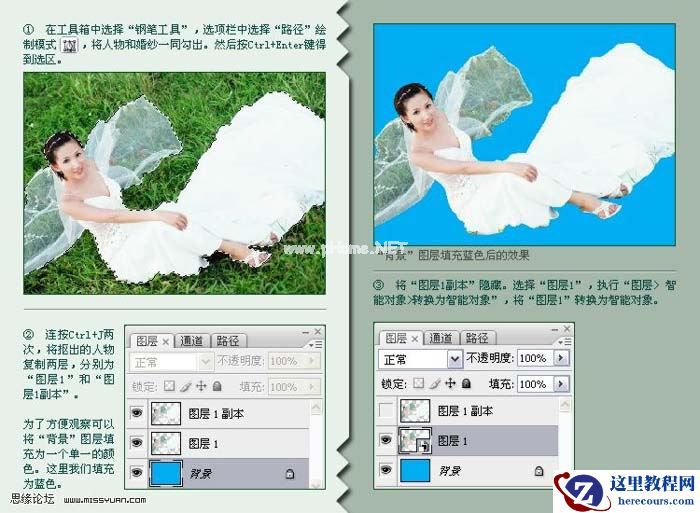 1、在工具箱中选择“钢笔工具”选项栏中选择“路径”绘制模式,将人物和婚纱一同勾出,然后按Ctrl+Enter键得到选区。