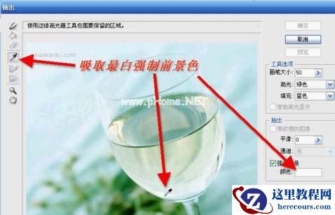 打开抽出滤镜界面,勾选“强制前景”,用吸管工具在玻璃杯上最白的地方点一下,吸取最白的颜色,这是因为玻璃杯的大部分是白色,吸取的目的是用来作为抽出的前景色。