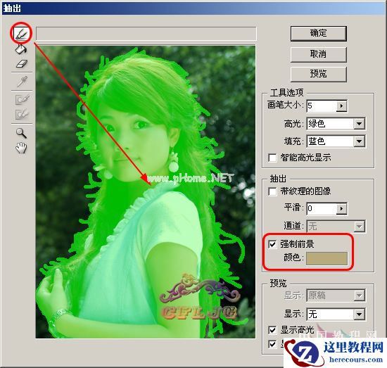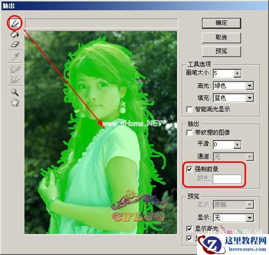 2、在图层1执行滤镜--抽出,在强制前景处打勾,颜色设定为白色,用边缘高光器工具按图示涂抹绿色,需要注意的是细心与否是成败的关键,在边缘的发丝处用小一点的笔触(这里选择了5)一根一根的涂抹(若看不清可用放大镜工具把图放大),中间的部分可用大一些的笔触涂抹,以节省时间。