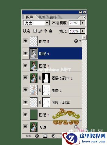 7、下一步是进行锐化和提亮的处理,ctrl+shift+alt+e盖印图层,得到新的图层3,在图层3执行图像--模式--LAB颜色--不拼合 --通道--明度--ctrl+a--ctrl+c--点LAB通道回到图层3--ctrl+v得到图层4,图层的混合模式设定为亮度,不透明度调至 70%。对图层4执行滤镜--锐化--USM锐化--数量50%--半径2像素--阈值0色阶,图像--模式--RGB颜色。OK收工。