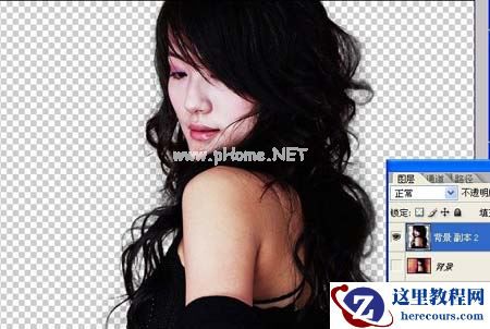 4、点确定,头发被抽出,如果你觉得头发颜色浅,可以ctrl+j拷贝副本。此时画布和图层面板如下图所示:
