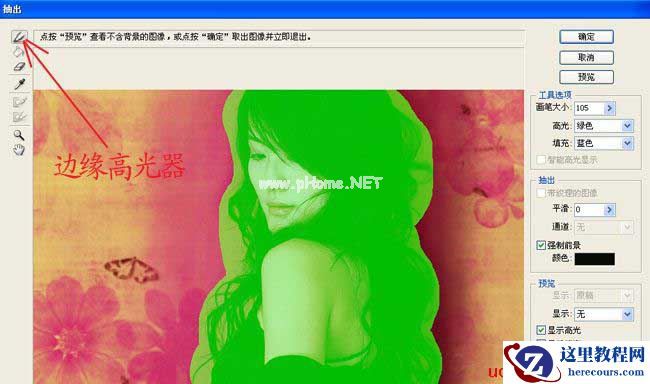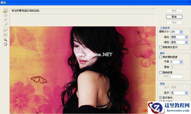1、打开图片,复制背景,关闭背景眼睛。单击滤镜-抽出,弹出对话框,如下图:
