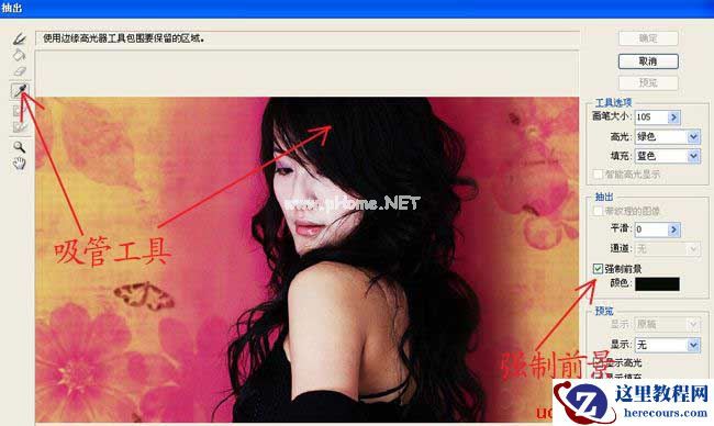 2、强制前景打上勾,用吸管工具在头发上吸一下,如下图: