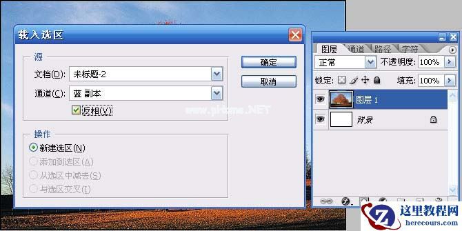 5、然后回到图层,点击“选择”菜单下面的“载入选区”,注意通道选项那里,选择蓝色副本,勾选反相。