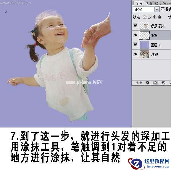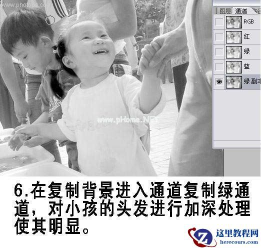 6、再复制背景,移到图层的最上面,进入通道面板,把绿色通道复制一层,对小孩的头发进行加深处理,使其明显。
