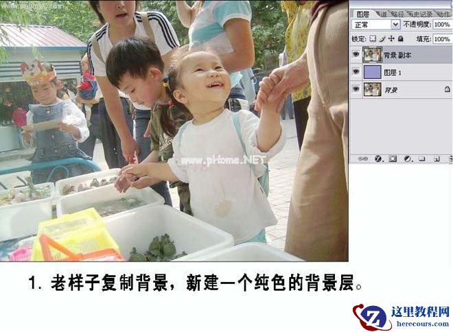 1、打开原图素材,把背景图层复制一层,然后在背景图层上面新建一个图层,填充蓝紫色,如下图。