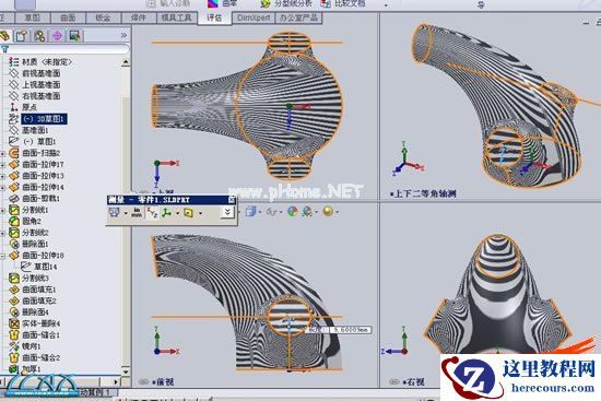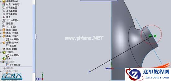 8以右视基准面建立的侧边轮廓线为源图,建立分割线,将刚拉伸的圆形曲面分割,(这也就是为什么第五步中的侧边轮廓线要延长)