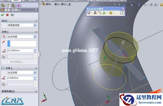 6以刚拉伸的曲面为基准,选取线框中圆形轮廓,转换实体引用,建立拉伸曲面,方向1深度要超过所建立的主体建构,方向2深度自定,这里选5mm(为什么要拉伸方向2,慢慢往下看)