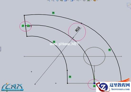 10以右视图为基准面。画直线,选择圆形边线。建立中点,和垂直约束关系,