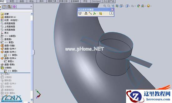 13选右视基准面,和两圆相交处,建立分割线(这步万不可省略,将导致以后抽壳的厚度