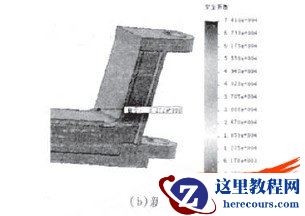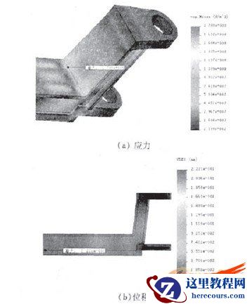 以上的准备工作做完之后就可以直接运行分析,得出分析结果。CosmosWorks通过彩色云图显示应力和位移的分布,以不同的颜色表示不同范围的应力值,能形象逼真地表现车桥内部的应力和位移应变分布情况。图5所示的是原车桥的应力、位移图解。