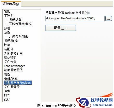“工具——选项——系统选项——异型孔向导/Toolbox”进行设置。