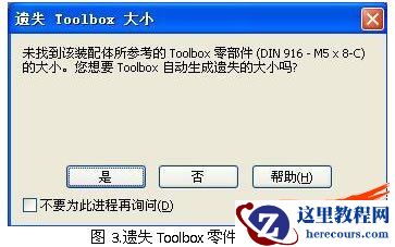 在安装SolidWorks于不同电脑的环境下,由于各个电脑硬盘分区不一致,使得SolidWorks Toolbox的安装路径不同。因此一个装配体已经应用了Toolbox库中的标准零件,换到另一台电脑下打开,就有可能出现找不到Toolbox库中的标准零件的情况。主要原因就是SolidWorks Toolbox的路径不同。当然SolidWorks会提示您自动按照您自己电脑Toolbox的安装路径生成遗失Toolbox零件。(图3)