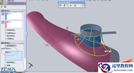 9这一步圆角,通过面选择,注意的是,包络控制线要选择我们刚才所建立的分割线,用它来结束圆角上部的终止位置
