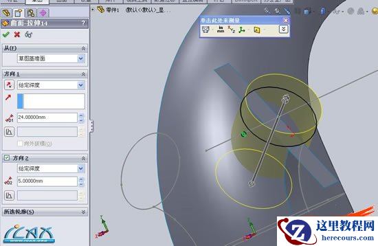 6以刚拉伸的曲面为基准,选取线框中圆形轮廓,转换实体引用,建立拉伸曲面,方向1深度要超过所建立的主体建构,方向2深度自定,这里选5mm(为什么要拉伸方向2,慢慢往下看)