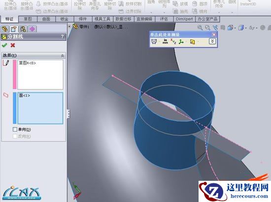 13选右视基准面,和两圆相交处,建立分割线(这步万不可省略,将导致以后抽壳的厚度