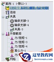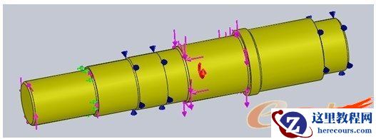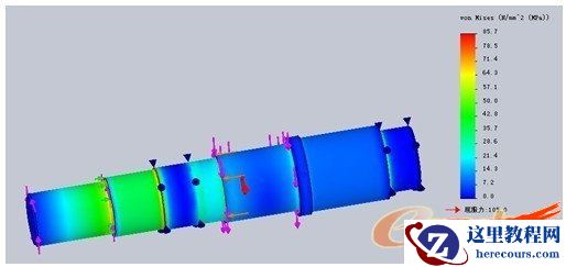 2.正确使用夹具约束传动轴,分析中给传动轴添加轴承支撑并添加高级夹具,使其轴向不平移。根据前面计算得出的力,结合实际情况给传动轴施加载荷。其结果如下图所示: