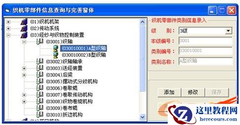 织机关键零部件数据库的实现,主要是织机关键零部件分类信息的确定。本课题依据上述思想与理论,考虑到我国现行织机零部件的分类标准与实际情况,在对各种典型无梭织机进行系统化研究与分析、分门别类对织机关键零部件进行归纳整理、提取各类别关键零部件通用特征的基础上,采用多级编码制对相应织机零部件进行编码,建立的相关数据库如图3所示,数据库选用当前非常流行的Microsoft公司的Access 2003数据库系统。在此基础上,考虑到系统的开放性,使用VB 6.0语言开发了织机零部件信息处理窗体(如图4所示)进行织机分类信息的查询与维护等工作。