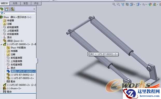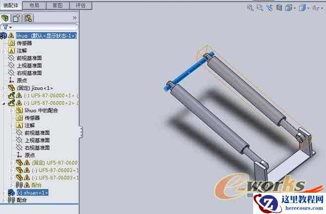 上图想实现气缸的同步运动,而且气缸子装配体内的配合限制要起作用,按照常规的手段装配好后,就会报错。虽然能够实现运动,但是子装配的限位配合不起作用了。