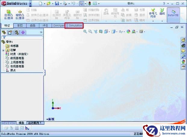 1.启动SolidWorks软件及SolidWorks Simulation插件通过“开始”菜单或桌面快捷方式打开SolidWorks软件 并新建一零件,然后启动SolidWorks Simulation插件,如图1所示。