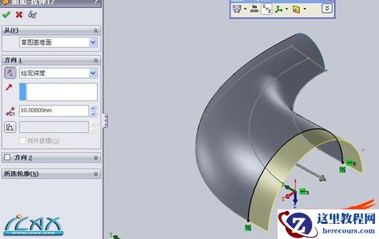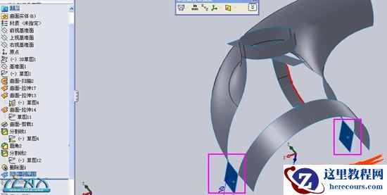 12曲面拉伸、紫色线框所示,。。这里我们将图中红色所示线条取名。。线条AA