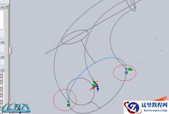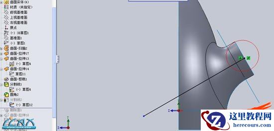 13选右视基准面,和两圆相交处,建立分割线(这步万不可省略,将导致以后抽壳的厚度