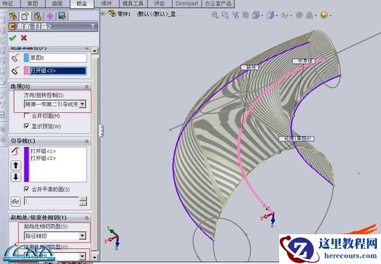 3开始扫描,以中线为路径,边框为引导,建立扫描,方向扭转控制沿引导变化,,起始结束与路径相切。