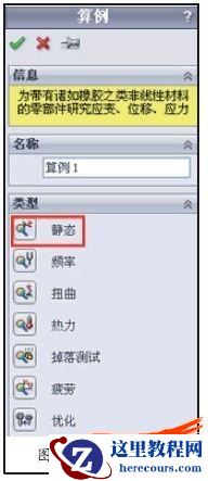 下方的小三角,在下级菜单中单击“新算例”按钮。在左侧特征管理树中出现如图4所示的对话框。
