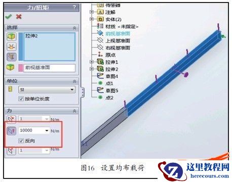 ,在图形区域选中“拉伸2”实体,并 设置参考几何体为“前视基准面”,再设置单位为“S I”,并 勾选“按单位长度”,按图示设置力的大小为10000,方向如 图16所示,必要时单击点选“反向”,设置后单击“确定”按钮