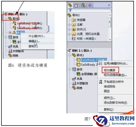 4)在Simulatio n算例树中, 展开“零件2 ”,用右键单击“S o l i d B o d y 1”并选择“视 为横梁”;同理,用右键单击“SolidBody 2”并选择“视为横 梁”,如图6所示。注意:此时,左侧的特征树发生了变化,多出了一项,如图7所示。用右键单击“结点组”,然后选择“编辑”,出现如图8所示的属性 面板。单击“计算”按钮,在结果栏中将出现三个接点,单击“确定”按钮