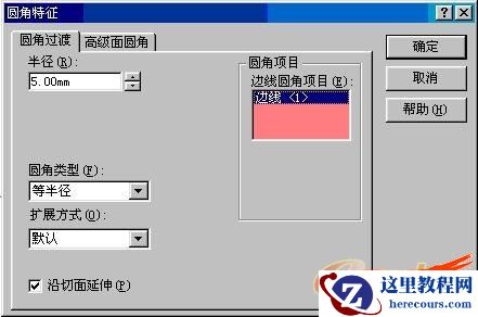 选择上图所示5mm的边,作为圆角的边,半径的值改成5mm,其他设置如图。