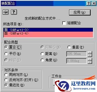 5、在配合类型,选择重合,在对齐条件中选择最近处