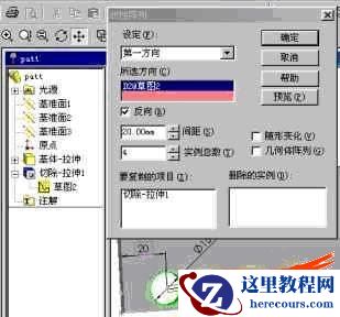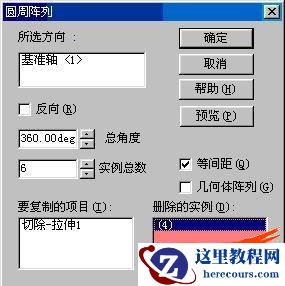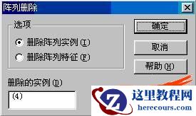 2、删除其中一个元件:双击阵列(设计树中)----选择其中一个元素(注意一定要选中实例,不要选择实例的边线,可以选择面)---按下DEL键--出现右图对话框。,注意对话框中的"删除阵列实例",删除的实例中有(4),表示第4个实例被删除。按确定