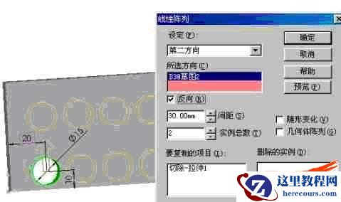 线性阵列:将一个具有一个或两个尺寸定位的特征沿尺寸方向建立若干特征。