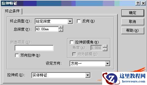 1、单击特征工具条上的拉伸凸台/基体按扭,就会显示拉伸凸台对话框和由草绘生成的等大的实体图