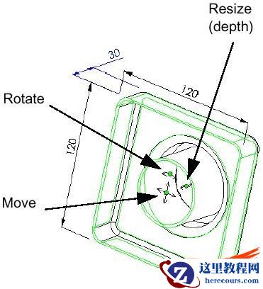 注:观察一下你正在改变的尺寸处指针的变化。当你释放鼠标时,零件按新的尺寸重新创建。