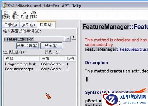 继续往下读,目的是找到创建圆柱体的命令代码。判断的依据是命令的英文词意,再建模的时候我们做了两件事情:创建草图和拉伸。在下面的代码中有两个命令:Part.CreateCircle和Part.FeatureManager.FeatureExtrusion,然后打开SW帮助菜单中的API帮助主题。