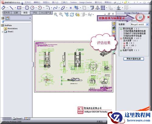 打开SolidWorks档案(包括工程图、零件、装配体),选择的标准文件进行标准化评估,一键快速生成检查结果。还可以使用相同的标准文件设置检查其他激活的文档,在激活的SolidWorks文档之间切换,查看多组结果。