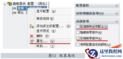 通过修改“总装配置”(包含所有零部件)的属性,可以允许操作者在设计“局部配置”的同时,把所添加的零部件和配合以还原状态添加至“总装配置”中。如图12所示,在“总装”配置的属性的高级选项中,取消“压缩新特征和配合”与“压缩新零件”选项,那么,在激活“简化”配置时添加的任何零件、配合与特征,都会以还原状态自动添加到“总装”配合内,不会被自动压缩掉。