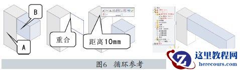 (8)避免循环参考。大部分循环参考发生在与关联特征配合的时候,有时也会发生在与阵列零部件配合的时候。如果装配体需要至少两次重建才能达到正确的结果,那么装配体中很可能存在循环参考。如图6所示,装配体中零件B的边线和零件A的边线有一个重合的关联参考,配合时在零件A和B之间添加10mm的距离配合,那么每次重建都会出错,并且零件B每次重建都会伸长10mm,这就是循环参考的典型错误。