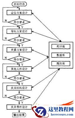 从图1可见,在基于通用CAD系统薄壁件夹具设计过程中,夹具CAD系统根据产品的CAD几何信息和CAPP加工工艺信息,进行夹具的方案设计、结构设计、精度分析、刚度分析、夹具总体装配,以及二维工程图的生成,并在此阶段对CAPP加工工艺中的有关定位误差,夹紧力进行计算和夹具综合评价、反馈,保证了工艺设计和夹具方案设计的合理性.各模块相对独立、信息相对集中;信息流动简单明了,可靠性高;各信息有机结合,为夹具CAD/CAE/CAM/CAPP等数据模型的共享提供了条件.夹具设计流程如图2所示.