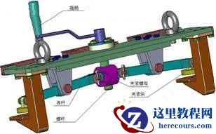 (5)在定位、夹紧装置确定后,依次设计连杆、螺母、螺杆、摇柄等传力构件,最终确定连杆旋转中心位置,从而完成整个设计过程。如图2;