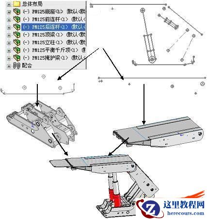 首先,根据初始参数,在装配体内进行总体布局(也可以称之为“骨架模型”绘制布局草图)、定义草图块,同时完成图块间的装配关系。验证结构设计正确后开始建立零部件的虚拟结构,把主要参数和结构形状传递到相应的零部件中。然后把设计任务(包含设计信息的子装配体)分拍到项目组成员手中进行详细设计,当详细设计完成后,进行汇总生成总装配体,验证完成后生成相应的工程图。在需要修改设计时,通过修改总体布局,所有相关零件会自动更新。