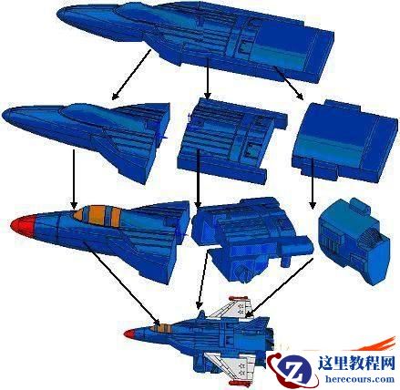 变型金刚的设计采用分割的方法,流程为:首先设计主零件,然后由主零件分割出不同的部分并分派到不同的零件内,对每个子零件进行详细设计,最后组装在一起。当设计变更时,只需修改主零件,所有的子零件会自动更新。