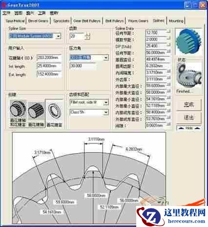 运行GearTrax软件,在图2所示界面中,选定Splines选项卡,表示创建花键。打开"Spine Size"标签右侧下拉菜单,选定模数m,此处根据零件图选为m=2;选定齿数z=28;压力角为30°;在"创建"标签下的三个图形中选择"画花键套"按钮;在"齿根和匹配"选项中,选择间隙类型为齿侧间隙;上述设置完成以后,软件根据设定参数自动计算出了"Spline Data"标签下的所有数据。设置无误的情况下,这些数据都应该和零件图标注的数据是完全吻合的。点击"Hide"按钮,在界面左下角直观的生成了齿形廓线,并且标注了相应的尺寸。