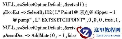 添加装配关系时,需要先选择装配的点线面,以柱塞和滑靴之间的重合配合为例,在零件建模时,若原点定在柱塞和滑靴的球面中心,则此时可通过ModelDocExtension::SelectByID2选择分别位于柱塞和滑靴原点的点,然后添加重合装配关系,程序如下: