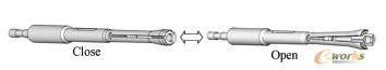 当芯棒向上运动时,芯棒端头挤入扩口胀管的胀头部分,从而使闭合的弹性夹头张开;反之,当芯棒往下运动时,芯棒端头离开扩口胀管的胀头部分,张开的弹性夹头自动闭合(图3)。